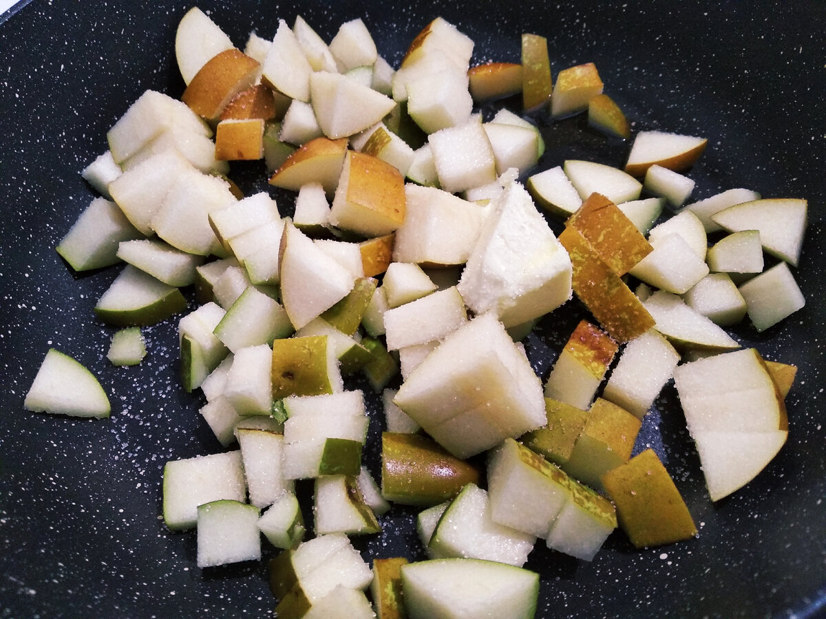 Всем привет=) Классическую шарлотку с яблоками пекут все. Это конечно очень вкусно, но я решила поэкспериментировать и испечь шарлотку с грушами. Рецепт очень прост. 4 яйца взбиваем с 1/2 стакана сахара, щепоткой соли , добавляем просеянную муку с чайной ложкой разрыхлителя , ( масса должна получиться как густая сметана ) . В начинку кладем 3 порезанные на кубики груши ( пережариваем на сковороде со сливочным маслом и сахаром ) : Добавляем груши в тесто , перемешиваем . Форму для запекания смазываем сливочным маслом , выкладываем тесто в форму , поверх пирога выкладываем нарезанные груши : Выпекаем ровно 30 минут, при температуре 180 градусов : Пирог готов . Подаём к столу : Пирог получается очень интересным на вкус, не кислым, нежным , мягким . С чаем очень вкусно, рекомендую .