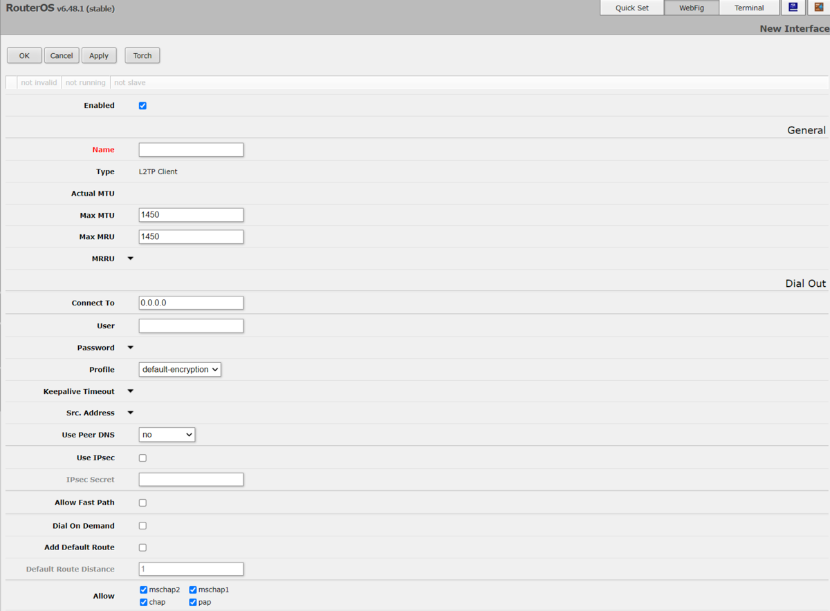 ОК, теперь мы знаем, что L2TP еще пока работает, но связи через него нет. Пинг идет нормально, роутер виден через winbox, но любое соединение или данные сразу рвутся. Посмотрим на настройки подключения: