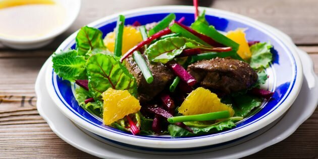 Тёплый салат с куриной печенью, апельсином и мёдом Ингредиенты Приготовление В миске соедините апельсиновый сок и по одной чайной ложке мёда, бальзамического уксуса и оливкового масла. Добавьте соль и перец по вкусу, а затем перемешайте до однородной консистенции. Каждую печёнку промойте, очистите и разрежьте пополам. Посолите и поперчите по вкусу. В сковороде разогрейте оливковое масло и обжарьте кусочки до золотистой корочки. Добавьте остатки мёда и бальзамического уксуса. Как следует перемешайте и тушите ещё пару минут, пока не выпарится уксус. Разделите печень на порции и разложите по тарелкам. Добавьте промытый салат и крупно нарезанные дольки апельсина. Полейте соусом, украсьте семенами кунжута. Подавайте салат тёплым.