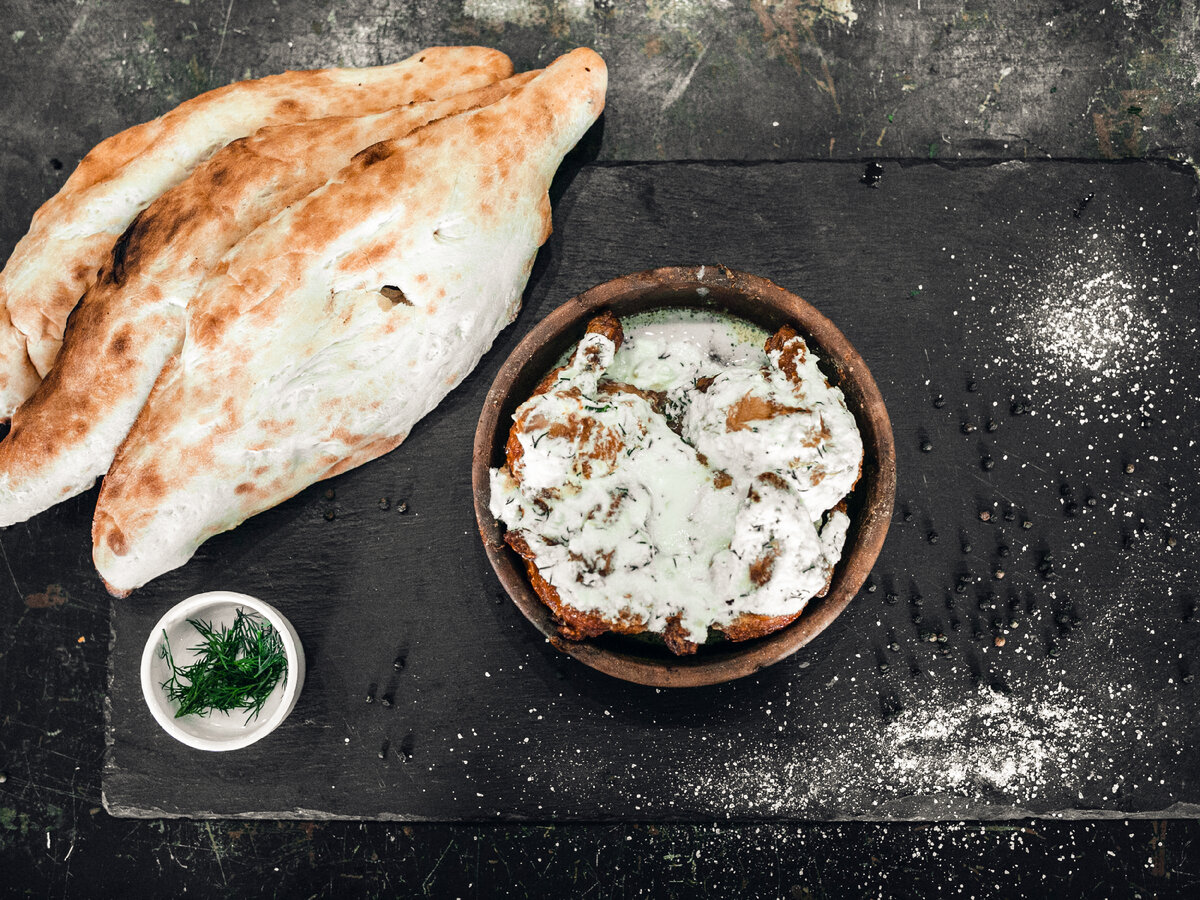 2. Отдельно готовим соус: чеснок и укроп листья мелко рубим ножом. В сотейнике смешиваем молоко. чеснок, сметану, укроп, солим. Ставим на плиту, прогреваем, помешивая, до растворения кристаллов соли. Доводим соус до кипения, после кипения
