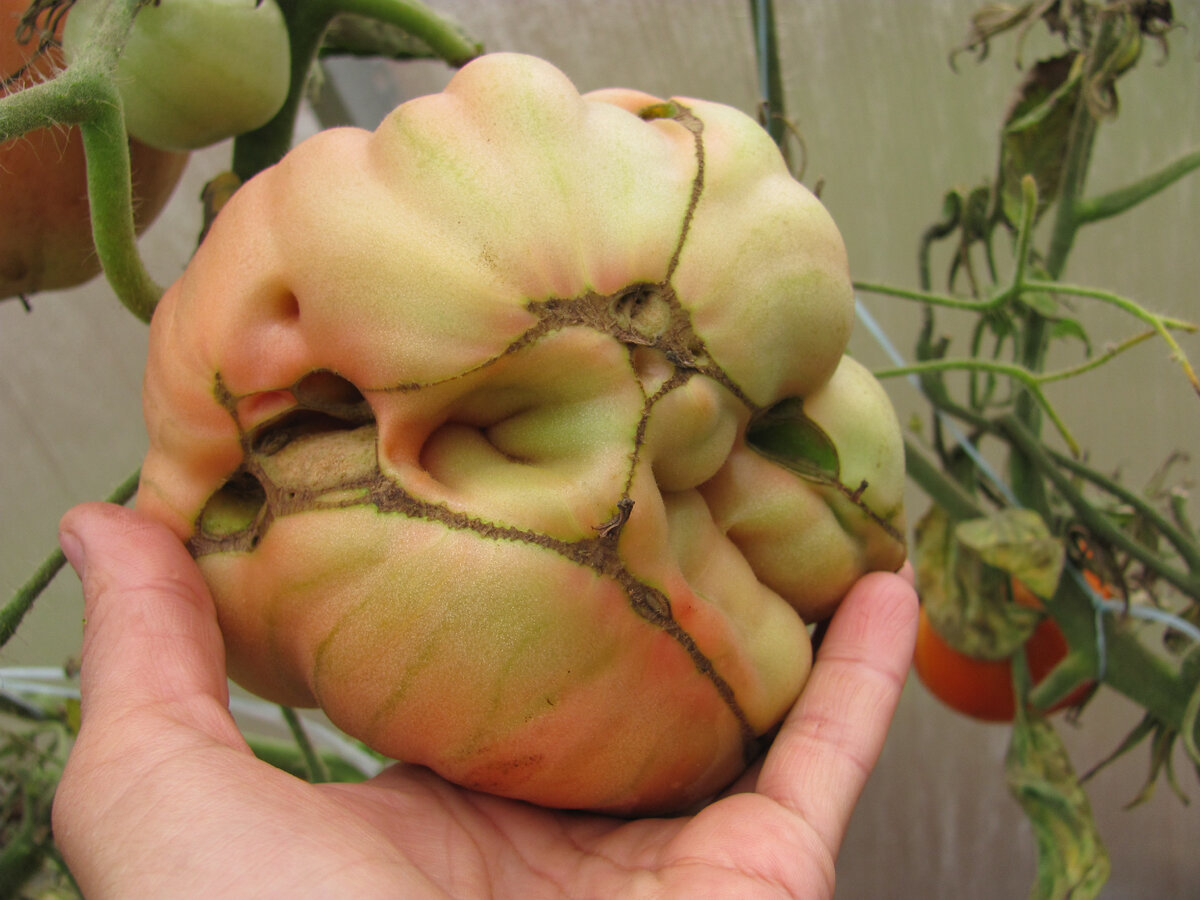 Что такое с томатами? Почему они имеют уродливую форму да ещё и покрываются снизу какой-то такой коркой?