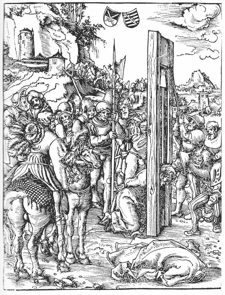 Перед вами гравюра немецкого художника эпохи позднего Возрождения Лукаса Кранаха Старшего «Усекновение главы апостола Матфея». Выполнена она в 1532 году. Великомученический сюжет в изобразительном искусстве - вещь, как известно, не уникальная. Как для самого художника (на его гравюрах перманентно кто-то страдает), так и для мировой живописи. То же "Усекновение головы Иоанна Предтечи" имеет какое-то бесчетное количество версий. Классический сюжет, ничего удивительного. Но здесь-то кое-что удивительное есть. Мало того, что непонятно откуда Кранах черпал сюжет. Все же по канону не Матфею (Левию Матфею), ни Матфию голову, вроде как, не отрубали. Так еще и способ приведения казни в исполнение для такой картины не обычен. Типичное усекновение - работа мечом. Посмотрите по многочисленным аналогам. Здесь же у нас налицо практически мадам Гильотина. И да, понятно, что и к путешествиям во времени для изображения библейских сюжетов мы привыкли: вон вокруг тоже явно не римляне в доспехах ра