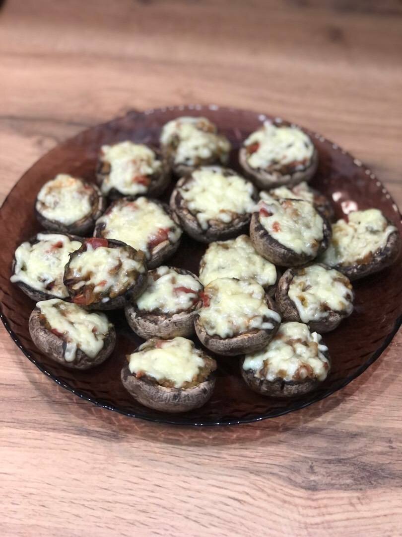 Ингредиенты: Шампиньоны, Лук, Помидор, Залень, Сыр, Чеснок, Майонез, Любое масло для жарки Способ приготовления: Удаляем ножки у грибов и мелко нарезаем. Грибы выкладываем на противень. Нарезаем лук, отправляем на сковороду, смазанную маслом, жарим на среднем огне 5 мин. Добавляем к луку нарезанные ножки, жарим еще 5 мин. Далее добавляем нарезанный помидор, солим, перчим и жарим еще 5 мин. Даем немного остыть начинке. Добавляем нарезанный чеснок и зелень, все смешиваем. Смазываем майонезом грибы и укладываем начинку. Сверху посыпаем тертым сыром. Ставим в духовку на 15-20 мин на 180 градусов. Я ставила на средний уровень духовки и выбирала нижний режим подогрева. Приятного аппетита!