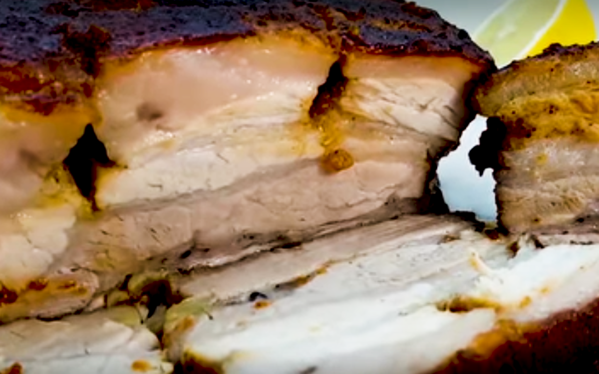 Очень вкусное и ароматное мясное блюдо без особых хлопот и забот! Подчеревок – это мясо с прослойками сала, вместе со шкуркой срезанное с нижней части свиной туши. Из тонкого подчеревка я иногда готовлю рулет, а более высокий подчеревок запекаю в духовке. Такое блюдо подают в качестве холодной закуски. Свиной подчеревок, замаринованный с чесноком, перцем или пряными травами, а затем запеченный в духовке – хорошая альтернатива покупной колбасе. Для запекания лучше выбрать кусок с широким мясным слоем и тонкими прослойками жира. Блюдо получается сытным, ароматным, в меру остреньким. ~ 2 кг свиной грудинки или подчеревок 1,5 чайной ложки соли, 1 чайная ложка черного перца, 1/2 чайной ложки красного перца 1 чайная ложка паприки, 1,5 чайных ложки сухого чеснока 4-5 зубчиков чеснока фаршировать мясо чесноком Хорошо завернуть мясо в 2 слоя фольги. Запекать 2 часа при 180 ° С, на 1 кг мяса - запекать 1 час. 1-1,5 кисло-сладкого яблока 6 столовых ложек соевого соуса 3 столовые ложки