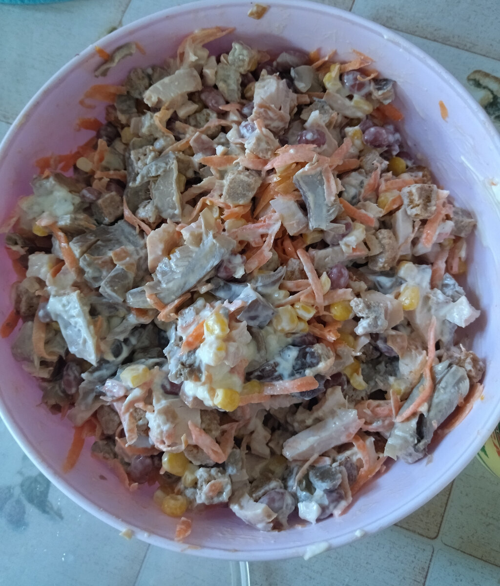 Этот салат за столом съедается самым первым. Название салата я уже не помню, но готовим его уже лет 5 и нравится всем. На праздничный стол, да и просто на обед/ужин он будет к месту. Ингредиенты Сухарики - 1 маленькая пачка Кукуруза - 1 банка Фасоль - 1 банка Грибы маринованные - 250гр Корейская морковь - 200гр Копчёная куриная грудка - 300гр Майонез - 3-4 ст ложки В ëмкость выкладываем корейскую морковь, кукурузу и фасоль. Маринованные грибы и куриную грудку режем кубиками добавляем все в ту же ёмкость. Добавляем майонез и перемешиваем. Сухарики можно добавить сразу, а можно перед подачей на стол. В зависимости от того какими вы их хотите видеть. Если жёсткими, то лучше добавить перед подачей, а если сразу смешать при готовки, то они будут мягкими. Обязательно попробуйте, готовится быстро и очень вкусный. Приятного аппетита.