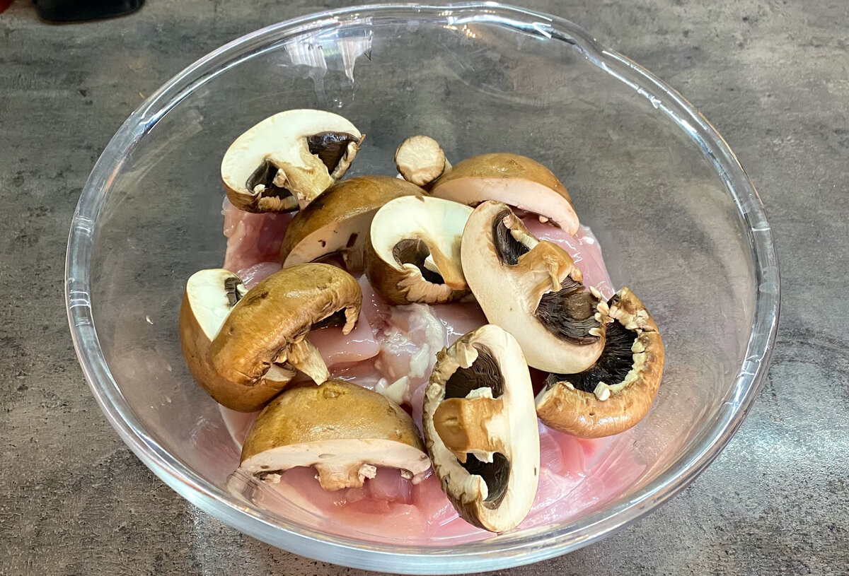 Мясо выложила в миску, дабавила промытые и нарезанные на две части шампиньоны.
