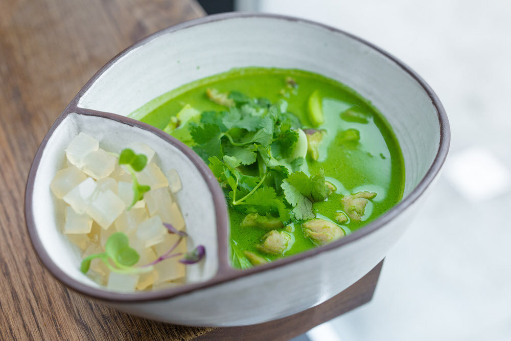 3) Добавьте кокосовое молоко, пасту карри, шпинат, пак-чой, лук зеленый и кинзу. Довести до вкуса солью и перцем.