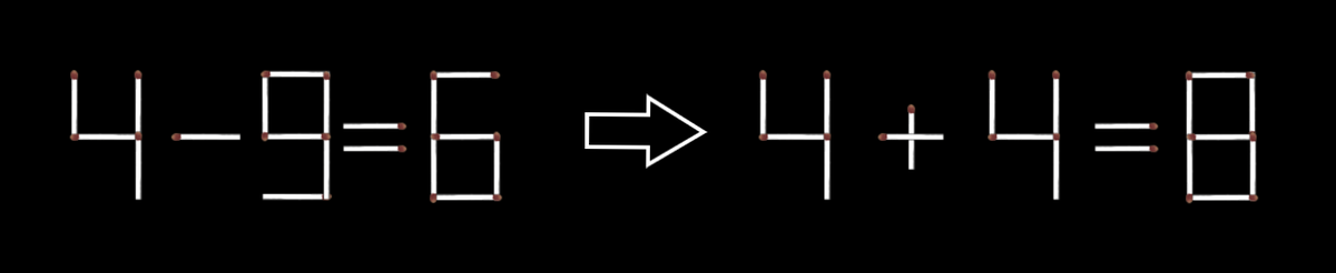 4) В данной головоломке нужно переместить 2 спички так, чтобы равенство стало верным. Пример (решений несколько, это одно из них):
