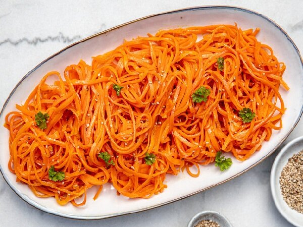 Подавайте корейскую морковку как закуску или салат, по желанию посыпав кунжутом.