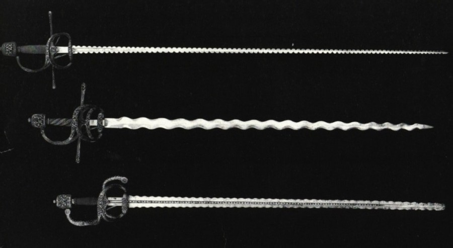 Тестировалась одноручная рапира-фламберг (в статье называемая фламбардом). Современная заточенная реплика. Такого типа, как здесь в центре: