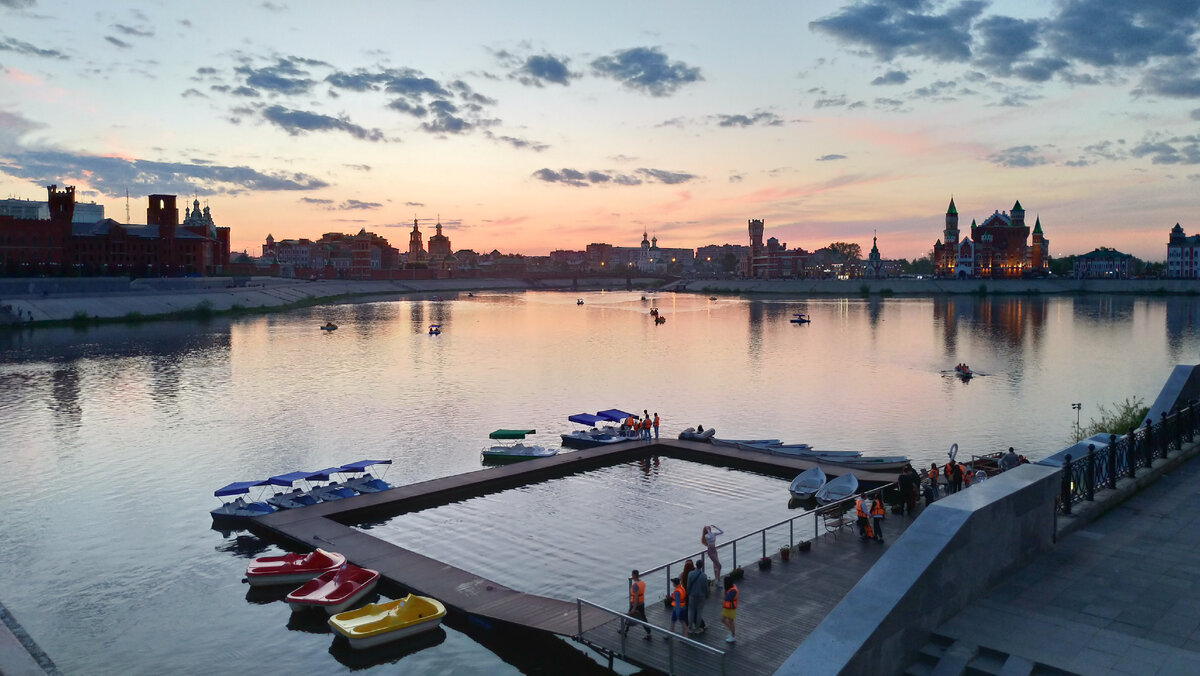 Также интересно, как окультурена часть реки Малой Кокшаги посреди этого центра. Она не просто закована здесь в бетонные берега, но и сделана полноценным местом отдыха с пристанью и лодочками. Хотя, в сердечке, остается даже не это, а… лягушки, которые начинают заливаться летним вечером здесь же, в центре, и запах не городской, а настоящей луговой речки.