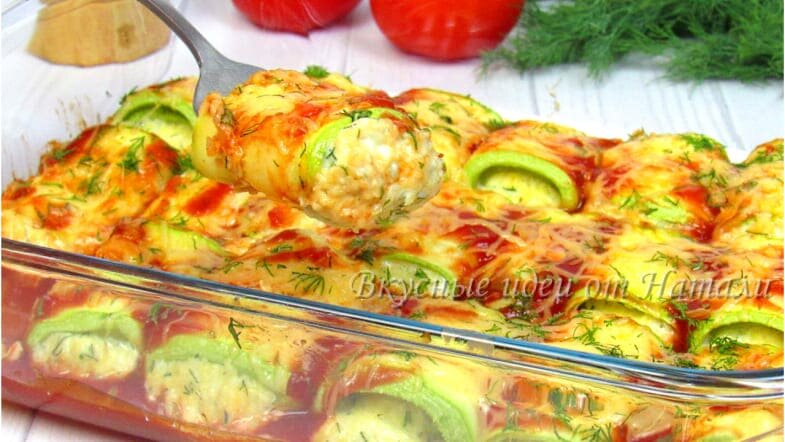 Блюда из кабачков у меня в семье очень любят и чтобы они не приелись, стараюсь готовить их как можно разнообразнее. И вот очередной рецепт заслуживающий внимания. Кабачки по нему получаются сочные, нежные и очень вкусные. Жарить ничего не нужно, готовится блюдо в духовке быстро и просто. Как приготовить: Кабачки тонко нарезаем, выкладываем на противень, чуть-чуть солим и отправляем в духовку на 15-20 минут, при 180 градусах (за это время кабачки станут мягкие). После запекания даем кабачкам немного остыть. Готовим начинку, смешиваем натертый на мелкой терке сыр, измельченную зелень укропа, выдавленный через пресс чеснок и майонез. Тщательно перемешиваем и начинка готова. Начинка может быть любая по вкусу, как и заправка начинки. Можно добавить дополнительно творог в начинку, сметану вместо майонеза и т.д.. Ориентируйтесь по своему вкусу и предпочтениям. Дальше на кабачки выкладываем начинку и сворачиваем в рулетики. В форму для запекания наливаем томатный соус, равномерно разравниваем.