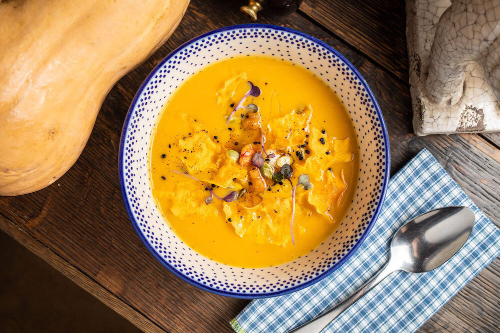 2) На кастрюле с толстым дном обжарьте на растительном масле мелко нарезанные лук и чеснок, затем добавьте тыкву и залейте куриным бульоном. Добавьте кокосовые сливки, проварите и доведите до вкуса солью.