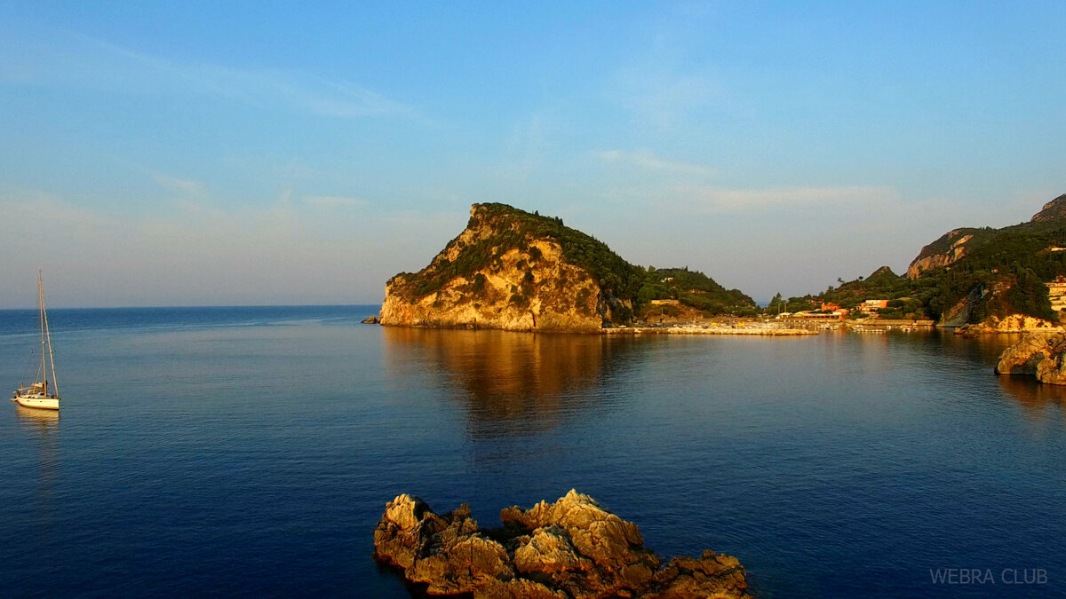 Но днём найти безлюдную площадку для взлёта очень трудно. Хорошо летать на рассвете с пляжа, пока нет людей. Чтобы песок не попадал в двигатели дрона, я брал с собой резиновый коврик. К счастью у отеля была каменная терраса над морем, которая после полудня так раскалялась, что была безлюдна, и с неё было удобно взлетать. Палеокастрица находится в северо-западной части о
