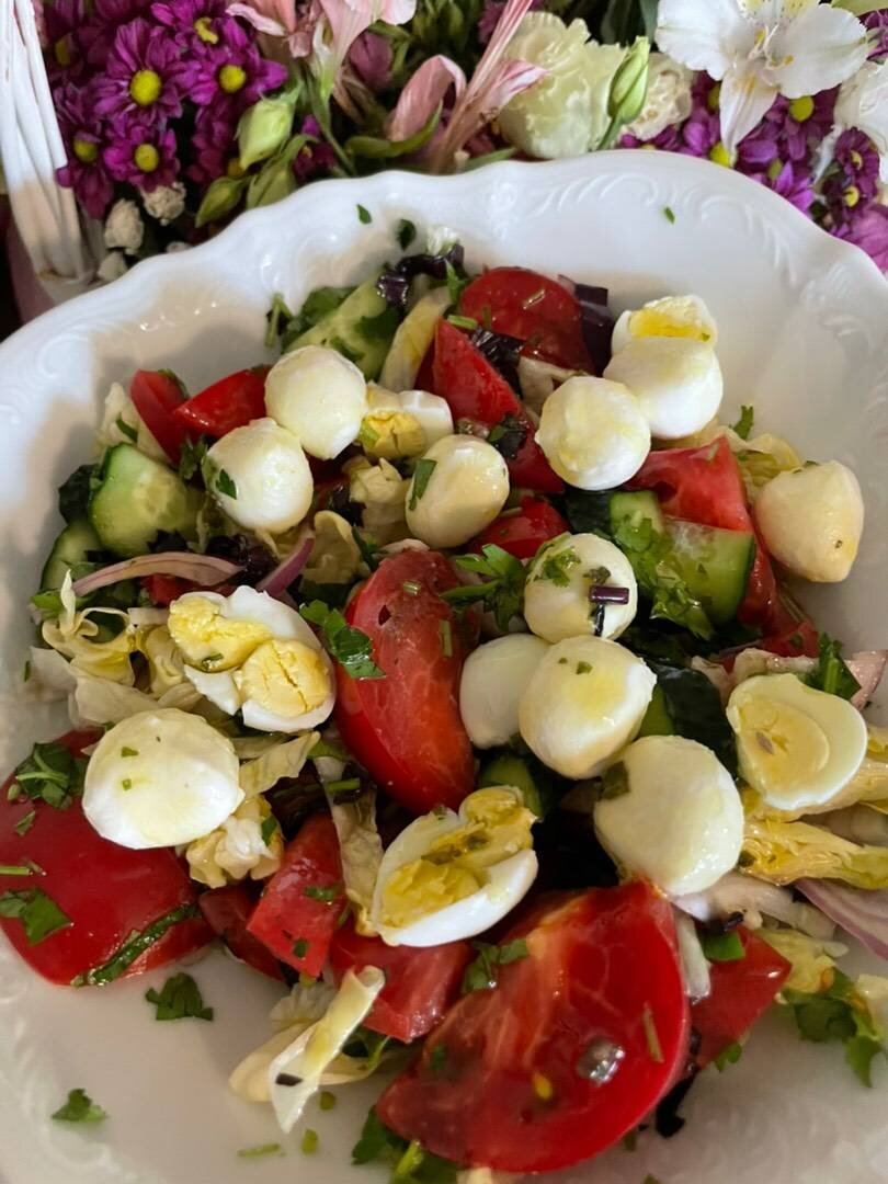 Легкий, нежный вкус летнего салата с сырной ноткой 👌🏻 Подходит как гарнир к мясу 👌🏻 #кукпадготовит #воскресенье Ингредиенты: помидоры 🍅, огурец 🥒, Зелень (кинза, укроп, петрушка) , Салат айсберг или листья салата по желанию, перепелиные яйца, Сыр моцарелла мини, Оливковое масло для заправки, Соль , Лук красный Способ приготовления: Овощи помыть! Помидоры нарезать крупно. Огурец нарезать средне ! Добавить к помидорам! Нарезать лук красный и добавить в салат (количество лука добавить на ваше усмотрение). По желанию добавить салат айсберг ! Зелень нарезать и отправить в салатницу ! Перепелиные яйца нарезать пополам, сыр моцарелла мини целиком добавить в салат. Салат посолить, полить оливковым маслом! Салат готов! Приятного аппетита 🤗