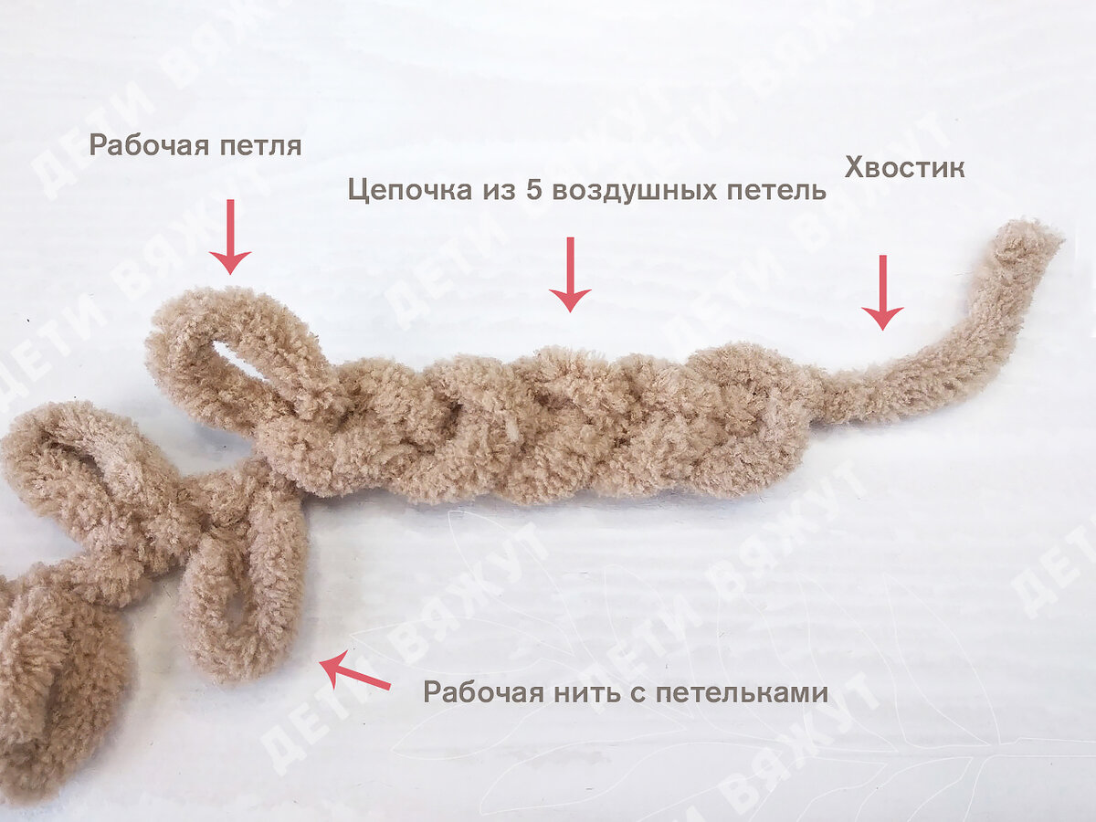 #школа_вязания #детскоетворчество #развитиеребенка #мастерклассыповязанию #детскиеподелки #сделай сам #вязаниедляначинающих С изучения этой техники мы начинаем самый первый урок в нашей школе вязания. Это - ЦЕПОЧКА из ВОЗДУШНЫХ ПЕТЕЛЬ. В схемах для вязания игрушки или какого-то изделия (шарф, снуд, тапочки и т.д.) она так и обозначается - ЦВП. Как она выглядит? На фото вы видите: - цепочку из 5-ти воздушных петель; - хвостик, который мы всегда делаем перед тем как начать вязание, разрезав одну или две петельки рабочей нити; - рабочую петлю, которая остается после провязывания цепочки; - рабочую нить с петельками. Как Выглядят лицевая и изнаночная сторона цепочки из воздушных петель и как их различать? Лицевая сторона напоминает косичку, петельки расположены друг за другом. Каждая петля воздушной цепочки состоит из двух полупетель (передняя полупетля ближе к вам, задняя дальше от вас). На изнаночной стороне можно увидеть перемычки - посередине каждой петли. На следующем уроке я покажу