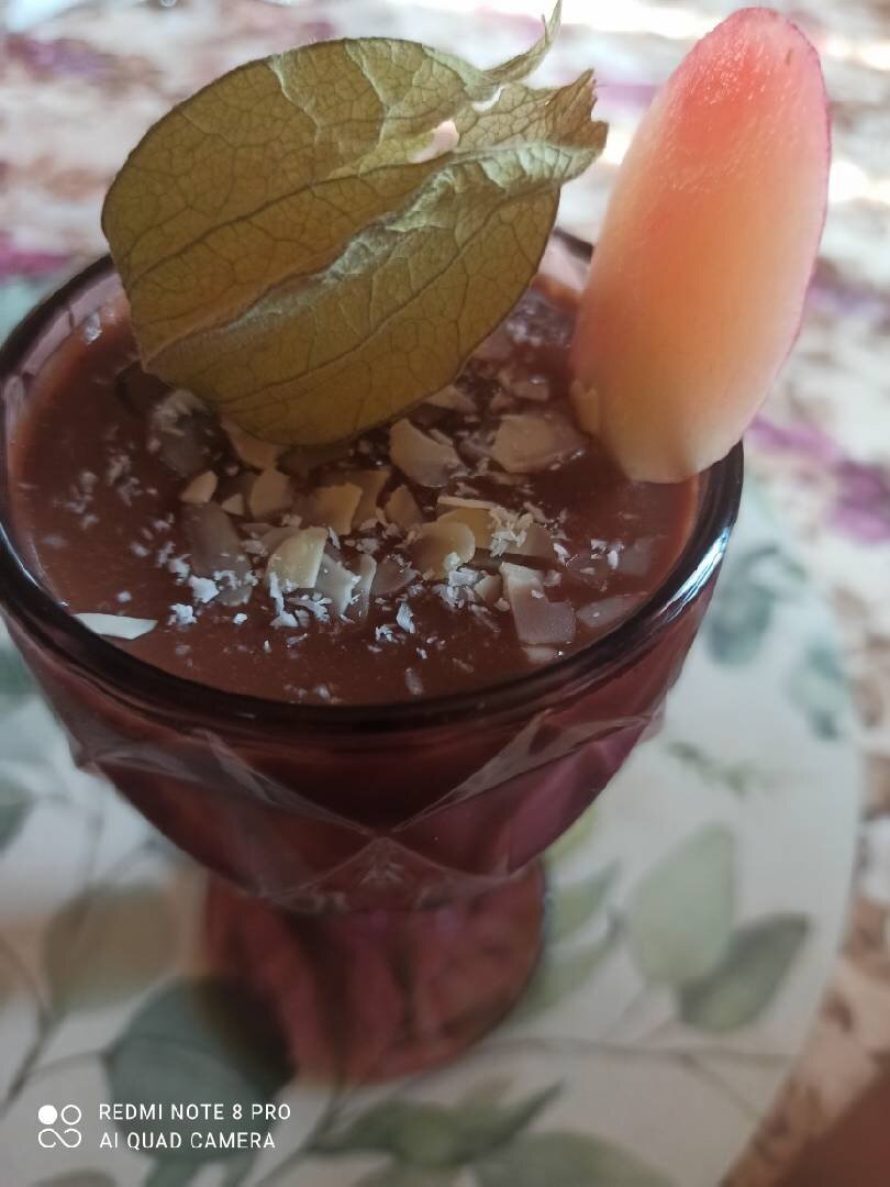 Десерт из сливок с шоколадом лёгкий и нежный, украсит стол и удивительно поразит гостей вашим вкусом и мастерством кулинара . Ингредиенты: Сливки 33% , Молоко 2.5% , Сгущëнка, Желатин, Шоколад молочный , Кокосовая стружка и миндальные лепестки, Физалис, Клубничное варенье , Семена Чиа, Персик Способ приготовления: Смешать желатин с молоком и сливками. 10 минут ждать. Поставить на огонь за минуту до кипячения выключить. Разбавить со сгущёнкой и вареньем смешать венчиком. Подстудить до тёплого состояния. Разлить по стаканам половину панна-котты положить миндальные листики и чиа. Ставим в холодильник, в среднюю камеру на 30 мин. Часть панна-котты смешиваем с шоколадом и греем до расплавления. Подогреваемый шоколадную панна-котта. Доливаем в стаканы до края. Остужаем до загустения 15 минут. Украшаем миндальными лепестками, семенами Чиа, кокосовой стружкой и листом физалис. Украшаем тарелку: на дольку персика втыкаем лист физалиса.