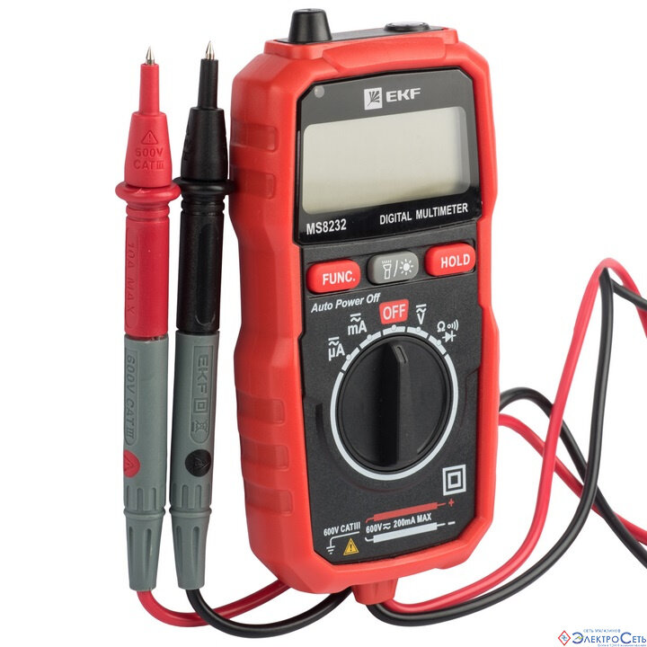 Питание обычно от батарейки напряжением в 9В(крон). В стандартном варианте имеется сам прибор два щупа. На самом приборе обычно три отверстия для подключения. Различия есть только между двумя обозначенными красным цветом и состоит оно в силе измеряемого тока.