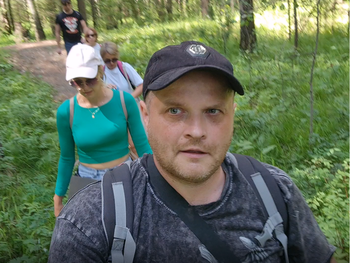 Знакомились несколько раз, потому что с первого раза всю толпу сложно запомнить, маршрут был несложный, пять километров по тропе и в конце одна крутая горка вверх и вниз. Ни палаток, ни тяжелых рюкзаков - поход всего на один день, поэтому с собой брали только воду и перекус. Я в порядке исключения тащил с собой дрон и батарейки, а проводник Михаил - зеркалочку. Надо сказать, что в любые походы не ходят всякие нытики и домашние белоручки - сразу понятно, что придется немножко жертвовать привычным комфортом для того, чтобы увидеть нечто новое. Как говорится, выйди из зоны комфорта:) Как правило, неадекваты в такие походы не ходят вообще, и в этот раз это правило полностью подтвердилось - команда была контактной и общительной