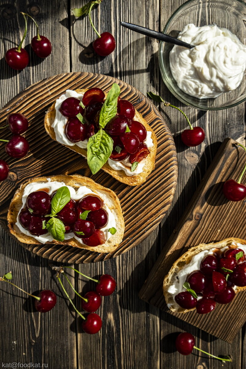 Кростини быстрая закуска, родом из Италии. Основа «кростини» это ломтик хлеба, который обжаривают, запекают или подсушивают. Ломтики хлеба надо поджарить так, чтобы сверху была хрустящая корочка, а внутри он сохранил свою мягкость. А дальше начинается полный простор для вашей фантазии! Начинку можно приготовить абсолютно любую: из мяса и рыбы, любых овощей и грибов, и конечно, фрукты и ягоды, сочетая их с творогом, сыром, медом и конфитюром! Пропорции определяются по вкусу и цвету! Сегодняшний рецепт до неприличия прост и времени на него уйдет не более 10 минут! Ингредиенты: 🍒 4 кусочка хлеба чиабатта (или любого другого понравившегося вам хлеба); 🍒 1 столовая ложка оливкового масла для обжаривания; 🍒 200 грамм рикотты; 🍒 цедра 1/4 лимона; 🍒 200 грамм вишни; 🍒 пару листиков свежего базилика; 🍒 2 чайный ложки бальзамического уксуса или соуса; 🍒 соль и перец по вкусу. Приготовление: 1. Вишню моем, разрезаем на половинки и удаляем косточки; 2. В подготовленную вишню добавляем