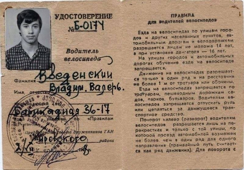 Сегодня погрузимся в прошлое и поговорим о документе, который существовал в СССР на протяжении нескольких десятилетий. Отвлечемся от статей на тему бизнеса, политики, новостей и криминала, потому что отдыхать тоже нужно. Права на велосипед Да, документ на фотографии выше – это водительское удостоверение, которое давало право на передвижение по дорогам общего пользования за рулем велосипеда. Для чего были нужны и как выдавались Конечно, дети в СССР катались на велосипедах по дворам, деревням и спортивным площадкам абсолютно легально. Права нужны были не для этого. Они давали возможность достигшим 14 лет гражданам выезжать на дороги общего пользования. То есть кататься по городу наравне с автомобилистами. Также были права и для тех, кто ставил моторы на свои байки. Получить их можно было уже с 16 лет. Чтобы стать законным велосипедистом, необходимо было прийти в отделение ГАИ по месту жительства. Никаких курсов и экзаменов не было. Приходишь с фотографией, тебе делают книжечку, в кото