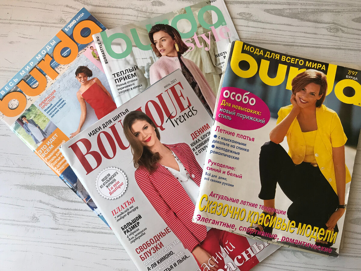 Времена узких джинсов, леггинсов давно канули в лету, теперь в тренде широкие брюки, которые могут быть как удлиненные, так и укороченные, если рост позволяет: это и классические брюки со стрелками, и палаццо (со складками на поясе, расширяющиеся от талии книзу), и кюлоты (укороченные брюки). Носить такие брюки лучше всего с не длинным и менее объемным "верхом", а если позволяет фигура, то облегающим, заправляя блузку или футболку за пояс полностью или частично или подвернув (приколов) ее спереди, чтобы она свободно свисала над брюками. Найти выкройку широких брюк не составит труда, это и журналы Burda, Patrones, и электронные выкройки. Ниже на фото представлены журналы, в которых можно найти выкройки таких брюк от маленьких размеров до +size. По обложке легче определить имеющиеся у себя журналы. Что касается электронных выкроек, то вот некоторые из них: Burda, Grasser, Vikisews, Шкатулка, Патыкова и многие другие, в поиске легко можно найти. Перед пошивом важно определить,