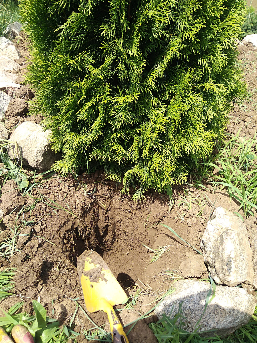 Вот, например, как я обустраиваю углублённый полив своей новой туи. Выкапываю яму недалеко от корней. Чтобы копалось легче – проливаю её водой. И уже радуюсь.