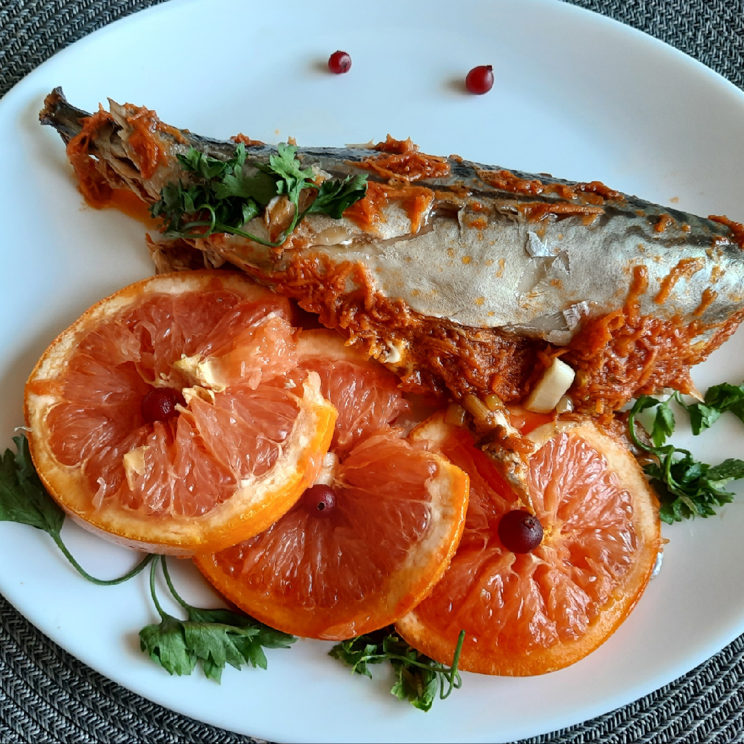 #лайфхаки Дякую за натхнення @olena_igorivna Ингредиенты: цибуля, морква, томатів у власному соці, скумбрії, грейпфрут, часнику, рослинної олії, Сіль, спеції Способ приготовления: Цибулю нарізаємо невеликими шматочками і обсмажуємо на рослинній олії до прозорості. Моркву натерти на мілку тертку і додаємо до цибулі, смажимо до готовності, додаємо подрібнені томати у власному соці. Тушкуємо ще кілька хвилин. Охолоджуємо. Рибу очищаємо, солимо. В керамічну форму виливаємо соус, викладаємо рибу, зверху кусочки часнику та порізаний кружальцями грейпфрут. Накриваємо фольгою та запікаємо 30 хвилин при температурі 170 градусів. Смачного!