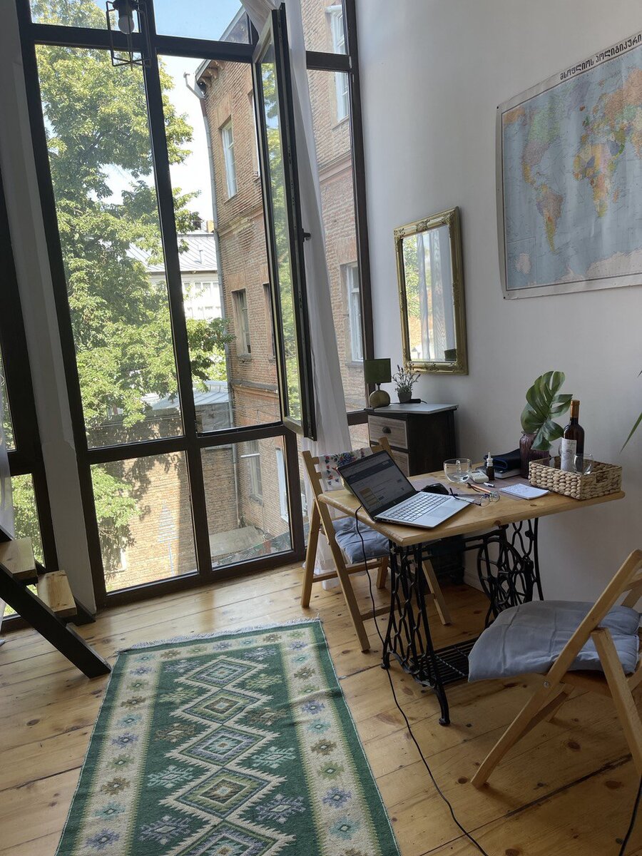 Я в горячем Тбилиси. Живу в маленькой квартирке в центре Города. Уютное дизайнерское пространство. Старый, дореволюционный дом. Парадная, напоминающая старые питерские парадные. Тяжёлые деревянные очень темные, с узором, но уже изрядно пошарпанные временем двери. Темная лестница на второй этаж. Вспыхивающий и почти сразу погасающий свет от датчиков движения. Нужно успеть попасть ключом в замок в момент вспышки. Сиреневая входная дверь открывается от поворота ключа. За ней две небольших комнатки, переходящие одна в другую. Первая встречает небольшим темно зелёным камином, закрытым наглухо темной металлической дверкой. Каминная полочка, на ней кувшинчики с традиционным изображением граната, символом плодородия и изобилия. Рядом с камином темно-зелёный уютный мягкий диван на деревянных ножках. Светлый солнечный деревянный пол. Доски широкие, покрытые лаком. По ним очень приятно ходить босиком. Напротив дивана крошечный кухонный уголок. Там есть старая электрическая плитка, с двумя порыжел