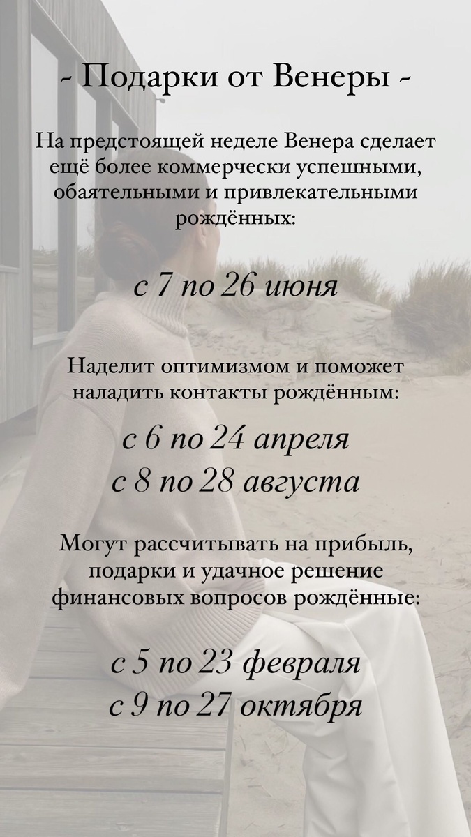 Центральным событием предстоящей недели станет Полнолуние в Козероге в ночь со среды на четверг. Оно мягко сменит эмоциональный тон на деловой, предложив сделать выбор между погружением в старые переживания по узлу прошлого и новым революционным опытом по узлу будущего. Хотя здесь не обойдется без Нептунианских иллюзий и обмана, которые будут старательно тянуть в прошлый опыт, старую компанию, которая уже могла изжить себя и не давать больше развития. Будет казаться, что туда вернуться жизненно необходимо, потому что там спокойнее и безопаснее. Но ключевое слово тут - "будет казаться". Не менее важным персонажем на этой неделе будет Венера, которую будет поддерживать благоприятным аспектом Сатурн, помогая "заземлить" и преобразовать в материальную форму все произнесенные слова и обещания, столько свойственные воздушной стихии Близнецов, в которых Венера сейчас пребывает. Это и оформление различных устных договоренностей в контрактные обязательства, и переход в более осознанную и взро