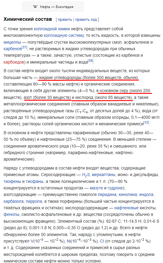 Много об этом товаре говорят, и неспроста. Всем она нужна, а мы её ещё и продаём, и что уж греха таить, зависим от её цены. Как только начинаешь интересоваться этим вопросом, сразу натыкаешься на какие-то н е п о н я т к и. Прежде всего, выясняется, что нефть бывает разная, на слуху названия марок нефти: Brent, Uralis и другие. Странные единицы измерения: баррели, градусы API. Попробуем во всём этом хоть мало-мальски разобраться. Прежде всего, нефть - это жуткая смесь всяких разных веществ, их полезность, а потому и стоимость, разные, так что их процентное соотношение влияет на стоимость продукта. Основу представляют парафиновые углеводороды, а они разные, хотя не очень-то и различаются по стоимости. Повышают стоимость нефти ароматические соединения: их выделяют и используют отдельно. А вот серосодержащие являются вредными. Вообще-то сера тоже неплохо горит, но при сгорании выделяет довольно агрессивный SO2, он ещё на стадии сжигания портит металлические дымоходы и теплообменн