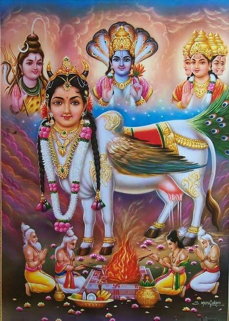 Камадхену (Санскр. kāma — желание, dhenu — дойная корова) — божественная корова, исполняющая желания, также известная как Сурабхи («сладко пахнущая») (санскр. surabhi — прекрасно пахнущая, ароматная), одна из 14-ти драгоценностей, появившаяся в результате пахтанья Молочного Океана дэвами и асурами. Была подарена богами мудрецу Васиштхе. Камадхену неоднократно пытались похитить. Однажды ашрам Васиштхи посетили восемь Васу (боги-прислужники Индры) со своими женами и одна жена уговорила своего мужа (бога неба Дьяуса) украсть корову. Заручившись помощью остальных Васу, он похитил корову, но был раскрыт. Разгневанный Васиштха наложил проклятие на Васу, согласно которому они должны были родиться в мире смертных. Семеро сообщников могли покинуть человеческий мир сразу после рождения, но организатор похищения был обязан прожить полную жизнь в теле человека. В другой раз в ашраме Васиштхи гостил царь Вишвамитра. Васиштха оказал царю всяческое почтению и с помощью Камадхену устроил для него