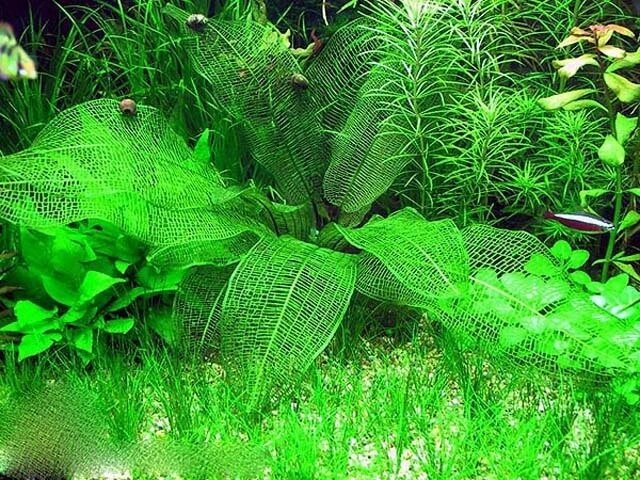 Апоногетон мадагаскарский (Aponogeton madagascariensis), или как его еще называют, Апоногетон сетчатый (Aponogeton fenestralis) — аквариумное растение, принадлежащее к роду Апоногетон (Aponogeton), семейство Апоногетоновые (Aponogetonaceae). АРЕАЛ ПРОИЗРАСТАНИЯ: Родиной Апоногетона мадагаскарского является остров Мадагаскар. Также предположительно может встречаться на Коморских островах и острове Маврикий, куда он завезен. Обитает в медленнотекущих водах, в тени деревьев и растений, растущих над водоемом. ОПИСАНИЕ: Существует большая внутривидовая вариативность Апоногетона сетчатого. Разные популяции требуют абсолютно разных условий. Это нежное и капризное растение с яйцевидными, удлиненными листьями, цвет которых варьирует от зеленой до красновато-зеленой. Ткань между жилками отсутствует полностью. Листья в длину достигают 30-50см, а в ширину 6-8см. СОДЕРЖАНИЕ: Аквариум для Апоногетона мадагаскарского должен иметь темный угол, куда высаживают растение. Воду в аквари
