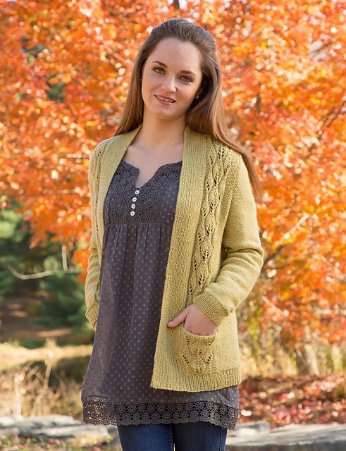 Жакет от дизайнера Тониа Бэрри называется Индийское Лето Этот женский жакет вяжется спицами отдельными деталями снизу вверх. Середину спинки и полочки пуловера украшает красивый узор листьями, подобно осеннему листопаду, устроенному на жакете. Этим же узором с листьями также связаны и небольшие карманы, расположенные внизу полочек. Описание вязания жакета от дизайнера Tonia Barry для женских размеров XS (S, M, L, XL, 2XL). Размеры готового вязаного жакета составляют: По груди: 34.5 (38.75, 43, 47.5, 51.25, 55.5) дюймов = примерно 87.6 (98.4, 109.2, 120.7, 130.2, 141) см. Длина жакета: 24.75 (25.25, 25.75, 26.25, 26.75, 27.25) дюймов = примерно 62.9 (64.1, 65.4, 66.7, 67.9, 69.2) см. Вязаный жакет выполнен из пряжи Soft Linen от Classic Elite Yarns. Состав пряжи следующий: 35% лён, 35% шерсть, 30% альпака. 125м/50г Вязать жакет будем спицами 3,75 мм. Или подберите свой номер спиц, чтобы получить указанные в описании плотность вязания. Из дополнительных инструментов потребуются держате