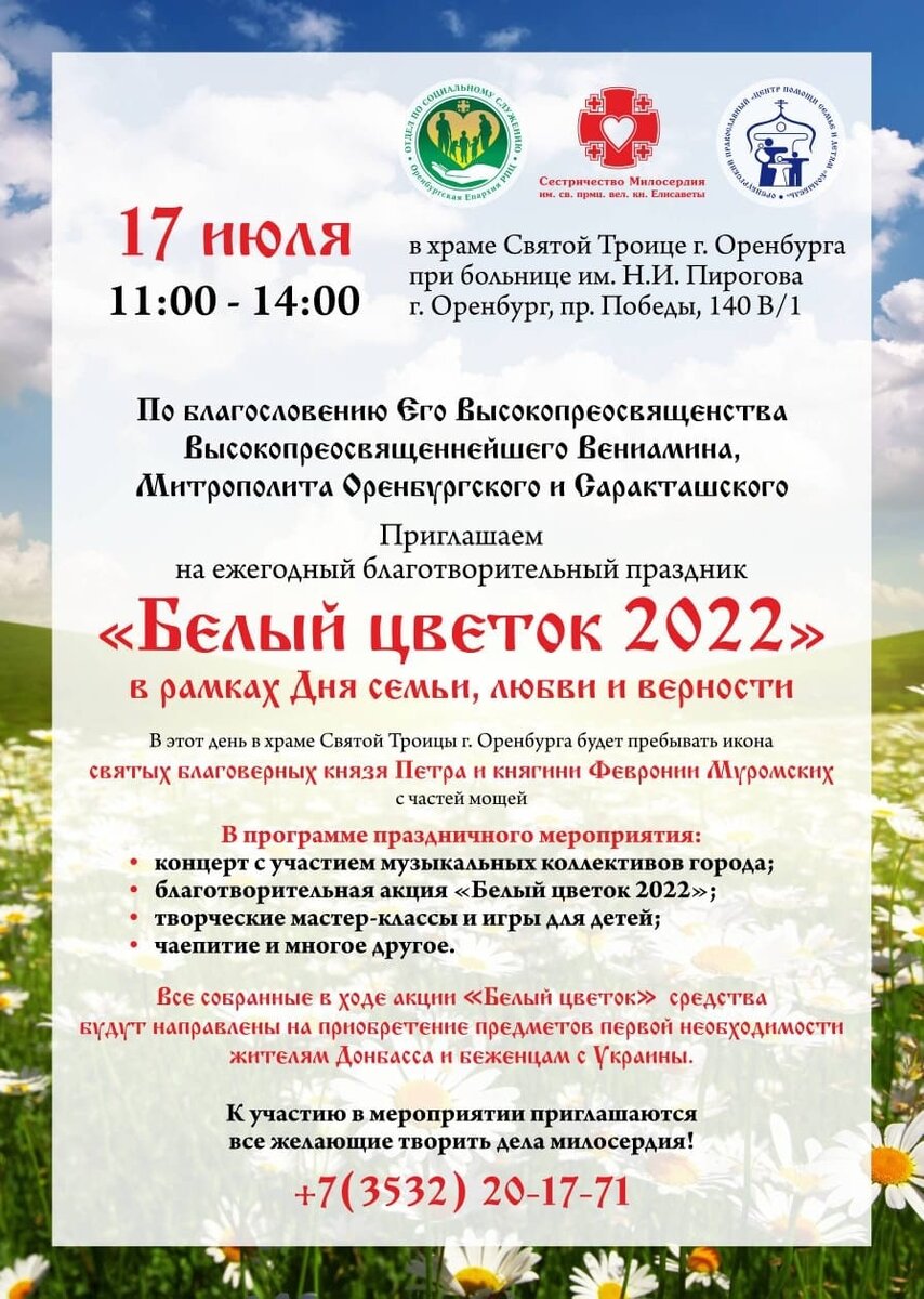 Приглашаем на праздник «БЕЛЫЙ ЦВЕТОК», посвященный Дню семьи, любви и верности! 📌17 июля 2022 г. с 11:00 до 14:00 на территории храма Святой Троицы г. Оренбурга при больнице им Н.И.Пирогова состоится праздник, посвященный Дню семьи, любви, верности «Белый цветок 2022». ❗️Организаторы мероприятия: Отдел по церковной благотворительности и социальному служению Оренбургской епархии (Оренбургская епархиальная комиссия по вопросам семьи, защиты материнства и детства, храм Святой Троицы г. Оренбурга, Сестричество милосердия во имя святой преподобномученицы великой княгини Елисаветы, Центр помощи семье и детям «Колыбель») при содействии храмов Оренбургской епархии, Оренбургской областной универсальной научной библиотеки им Н.К.Крупской, Православного молодежного объединения «Верные», Ивановского хуторского казачьего общества, Народного коллектива «Народная галерея», Медицинского диагностического центра, Дома пуховой моды Анны Советовой, Оренбургского областного художественного колледжа, Оре
