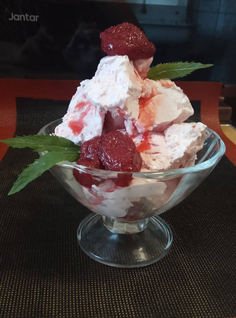 Гарне та смачне поєднання солодкого та кислого смаку з охолоджуючим ефектом, як раз те що потрібно в спекотну пору року. Ингредиенты: рослинні кондитерські вершки, полуниця, цукор, згущене молоко Способ приготовления: Вершки збиваємо з цукром спочатку на малих обертах міксера до легкого згущення маси і додаємо в декілька прийомів згущене молоко. Кожного разу перемішуючи не збільшуючи оберти. Після згущеного молока додаємо подрібнену на блендері полуницю і збиваємо до утворення пухкої, стійкої маси. Готову збиту масу перекладаємо у невеликі ємності, закриваємо кришкою та відправляємо на охолодження та застигання до морозильної камери на 5-6 годин.