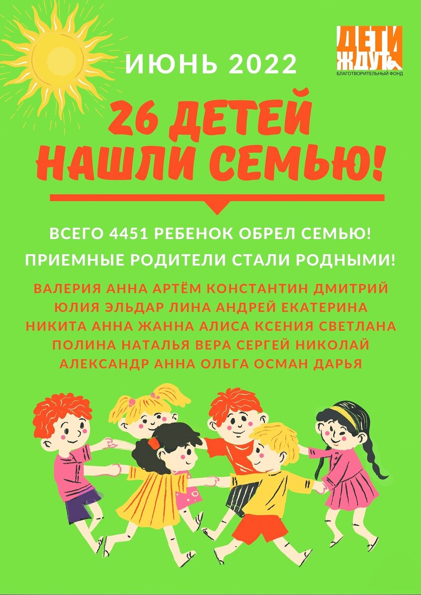Результаты работы проекта Дети-ждут.рф в июне - еще 26 детей НАШЛИ СЕМЬИ! 🌟 Спасибо приемным родителям за настойчивость на пути к своему ребенку, за смелость принимать решения, за ваши открытые сердца! Пусть ВАШИ дети обретут уверенность, любовь, поддержку семьи и на Вашем примере вырастут хорошими людьми! 💕 ДОЖДАЛИСЬ РОДИТЕЛЕЙ 🧸 малыши Осман, Никита, Эльдар 🚙 2-летний Артемка с непростым диагнозом ☀наши звездочки, девочки с ограниченными возможностями здоровья, 5-летняя Анечка, 4-летние Жанна, Даша и «солнечная» Алиса, 8-летняя Полина 🌸 «маленькая семья» 5 детей! Наташа, Саша, Коля, Сережа и Вера 🌟 подростки Костя, Юля, Андрей, Лина, Аня, Дима, Ксения 🌟 16-летние Оля, Лера и Аня и Светлана, которой в сентябре исполнится 18 лет! Самым младшим детям - 1 год, самым старшим - через несколько месяцев уже 18. Разве это не потрясающе?! Мы стараемся рассказать о каждом ребёнке, чтобы его увидели, почувствовали сердцем, чтобы с каждым днем счастливых и любимых детей становилось все боль
