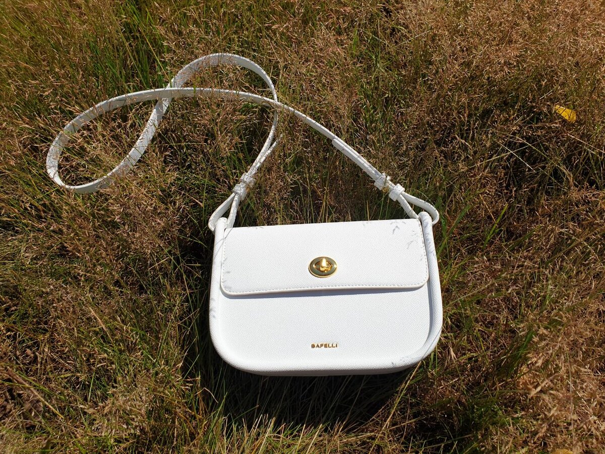 На этот раз сумка пришла мне, а не в подарок кому-то и я ее уже пару недель с удовольствием ношу! Итак, приступим! На этот раз сумка выполнена из спилка, но среди представленного ассортимента цветов есть те, что сделаны из натуральной кожи. Если не ошибаюсь - черная, синяя и сине-зеленая. Мне нужна была именно белая, поэтому я спокойно отнеслась к ее материалу и все равно ею очень довольна. Кстати цена за кожу и спилок одинаковая. Разница материалов видна в фактуре кожи. Натуральная - гладкая, моя - зернистая. Тактильно очень приятная. Сумка прямоугольной, жесткой формы. Я бы назвала ее даже меньше чем средней, потому что мой стандартный набор средней сумки в 24 см полностью не умещается, поэтому приходится отказываться от чего-то. Дизайн у нее очень лаконичный. Только "замок-пупок" и надпись "Бафелли" на передней части сумки. Вся фурнитура выполнена в золоте. Для белой сумки - это очень здорово, смотрится дорого. Ножек на дне нет. Внутри одно отделение и два кармашка. Один на молнии,