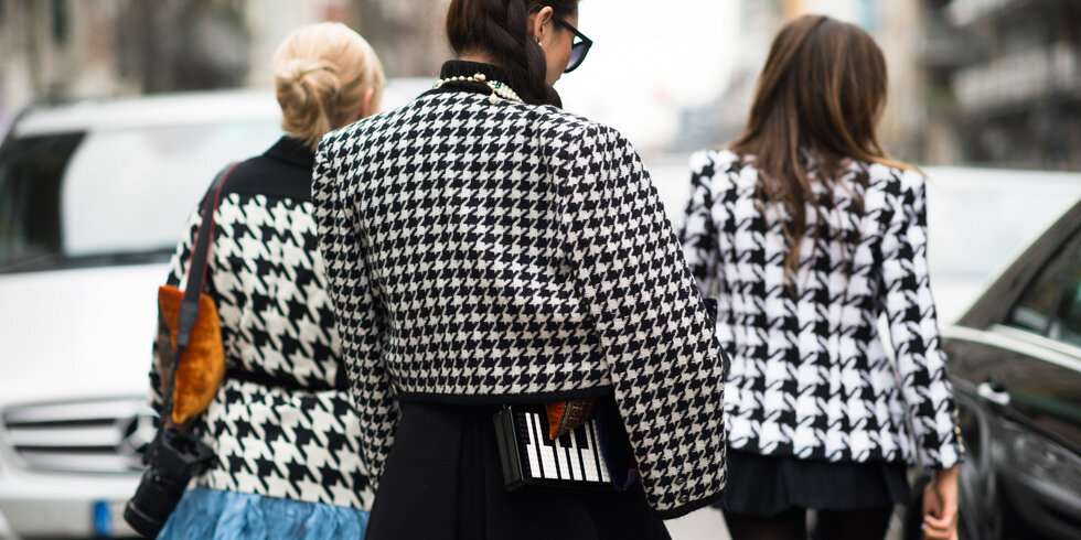 Как красиво звучит pied-de-poule, не правда ли? А по-нашенски, по простому - «гусиная лапка», а кто-то называет «куриная лапка», что никак не уменьшает изящности данного принта. Вообще, узор, так называемые «гусиные лапки», изначально появился в Шотландии и назывался houndstooth. В переводе "houndstooth" буквально означает "собачий зуб", "зуб гончей" форму чего и напоминает такая клетка. И мне такое прочтение нравится гораздо больше :) Я ведь закоренелый собачник, а не птицевод! Как давно этот узор с нами и покоряет подиумы? Остатки шерстяных тканей, украшенных «гусиной лапкой» археологи находили во множестве скандинавских могильников и этот орнамент часто встречается на британских церквях XII века и даже в элементах венецианской архитектуры. Он (узор) стар. Он - superstar! Около ста лет этот узор считается классикой вне времени. Диор, Шанель, Скиапарелли, Джеффри Бин, Ямамото, Маккуин… и это далеко не все. Но мы тут с вами не исследователи моды, а просто про вязание, так что… Делаем