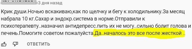И, конечно, в отличие от проходящих мимо "знатоков", которые тоже накидают с десяток ответов, как им "помогло" отсутствие / наличие завтрака, отсутствие / наличие жира в рационе, особенно спаржа хороша, а вот от гречки толку было не много - как ощущают уже постоянные читатели, в этих рекомендациях идет усугубление фиксации на еде.