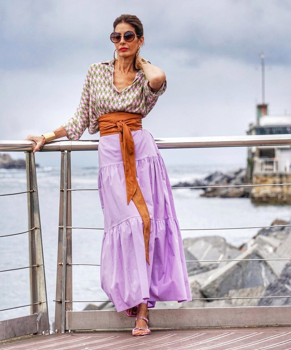 На примере вы можете видеть интересную стилизацию образа: инфлюенсер дополнила комплект широким поясом, подчеркнув линию талии. Приятный лавандовый оттенок юбки отлично сочетается со свободной блузой с ненавязчивым принтом, которую, при желании, можно с легкостью заменить на топ или майку.