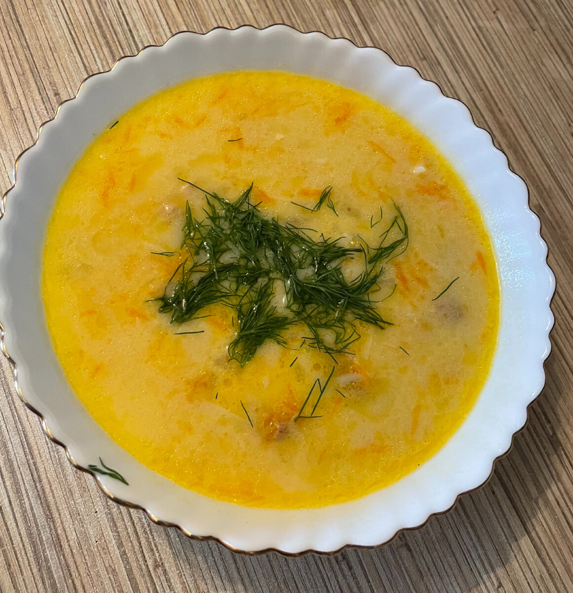 Друзья! Рада приветствовать вас на моём канале «Юня на кухне»! Сегодня поделюсь с вами рецептом моего самого любимого сырного супа! Настоящая палочка-выручалочка для каждой хозяйки! Приготовить такой супчик очень легко, родные будут в восторге! Для приготовления нам понадобятся следующие ингредиенты: Итак, приступим к приготовлению Шаг 1. Подготавливаем все необходимые ингредиенты. Для приготовления бульона я использовала бедро курицы, можно использовать грудку. В кастрюлю с холодной водой помещаем куриное мясо и варим около 30- 40 минут. После того как бульон закипит необходимо снять пенку Шаг 2. Пока мясо варится приготовим зажарку. Для этого лук очищаем от шелухи и нарезаем мелкими кубиками Морковь очищаем, промываем под проточной водой и трём на мелкой терке На сковороде растапливаем сливочное масло, обжариваем лук, затем к нему добавляем тертую морковь и чеснок, пропущенный через пресс. Обжариваем совместно овощи буквально 2 минуты Шаг 3. Варёное мясо вытаскиваем из кастр