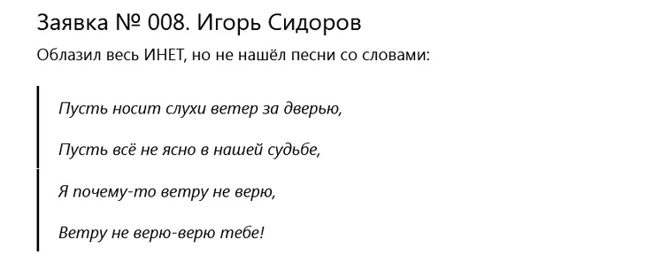 Здравствуйте! Ну я же говорю - чудеса случаются! Всё утро билась - искала песню для Игоря Сидорова (заявка №008), которую он слышал в исполнении Марии Пахоменко. Не нашла. Не той дорогой идём, товарищи! А до этого 2 года тому назад давала объявление о поиске - тишина. А сегодня почти сразу после публикации этой статьи активизировался преподававатель нашей школы Иван Помидоров. Вот что он написал в комментарии: А мне большего и не надо, дорогой Иван Помидоров! Мне бы зацепочку! А тут целая зацепища получилась. И год выпуска есть, и название. Ну а потом дело техники - мигом разыскала потеряшку. Только не в исполнении Марии Пахоменко, а ВИА "Романтики". Сейчас ещё попробовала найти в другом исполнении, кое-кто ищет Э. Хиля, но мне такой задачи поставлено не было, я не буду углубляться. Интересно, можно ли закрывать заявку? Как бы ещё автора этой просьбы теперь отыскать? :-))) Теперь ищу фото ВИА "Романтики". Нашла, но не знаю, те ли это самые "Романтики", которые пели нашу поте