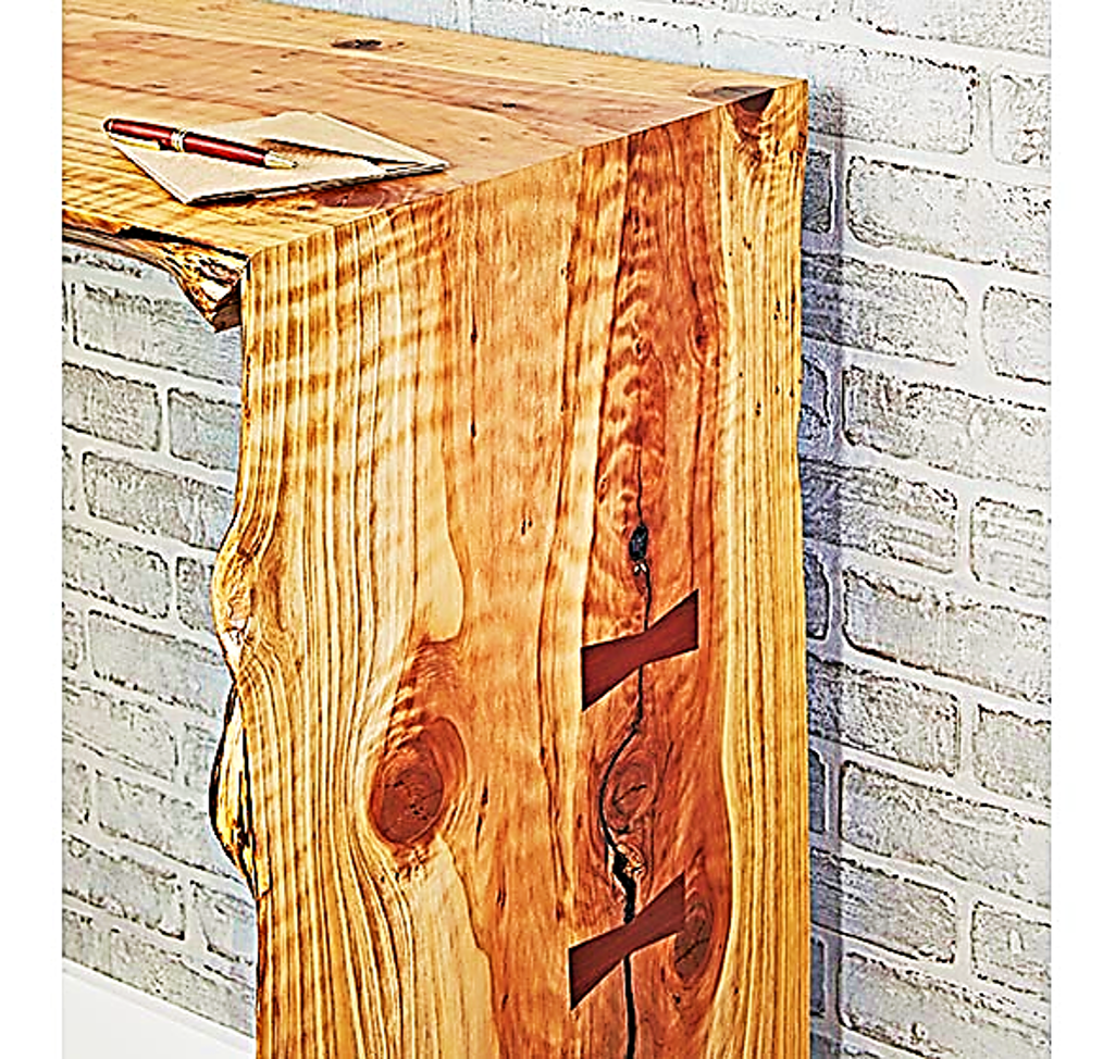 Затем оцените наличие трещин, сучков, включений коры, пустот или других дефектов плиты. Их заполнение или ремонт обеспечивает прочность, но обычно лучше всего сохранять все как можно более естественным. Трещины могут открываться больше по мере того, как плита приспосабливается к новой влажности окружающей среды, поэтому зафиксируйте их с помощью ключей-бабочки, как показано ниже .