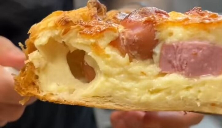 Понадобится: Сосиски-7шт Яйцо-4шт Сыр-200гр Слоёное бездрожжевое тесто Сливки 10%-200мл Мука-3ст л Готовим: Нарезаем семь сосисок, добавляем четыре куриных яйца, наливаем двести миллиграмм сливок, двести грамм любого сыра и 3 столовые ложки муки, все хорошо болтаем. Берем слоёное бездрожжевое тесто два слоя кладём их в нахлёст и катаем в тонкий пласт. Красиво выкладываем в форму и выливаем начинку. Убираем духовой шкаф при 180 на 40 - 45 минут. Приятного аппетита!
