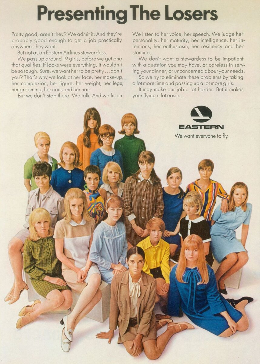 Представляем вашему вниманию… неудачниц. Ага, именно так и были представлены эти 19 красивых девушек в рекламе, которую вы видите. Все они стройные, приятные на вид, но при этом ни одна не улыбается. Так что произошло? Почему сразу «неудачницы»? Давайте добавим контекста, и всё быстро станет ясно. Реклама авиакомпании Eastern Airlines увидела свет в 1967 году (это понятно даже по характерным нарядам девушек) и публиковалась в журналах и газетах. Из сопроводительного текста следовало, что все эти 19 дам пытались стать стюардессами, но… получили отказ. Да, они могли бы устроиться практически куда угодно, но не в Eastern Airlines. Ясное дело, что это реклама и девушки, скорее всего, просто симпатичные модели. Нахваливая предоставляемый сервис, пиарщики авиакомпании рассказывают, что при приеме на работу оценивается фигура, рост, вес, внешность, макияж, волосы, ногти и длина ног. Это ещё не всё. На собеседовании учитывали даже тембр голоса, общую эрудированность и энтузиазм соискательницы.
