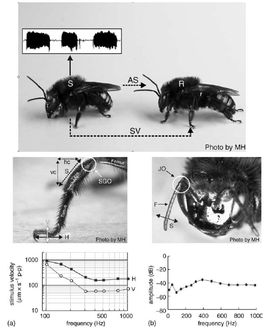 Как указывалось выше, термин "акустический" вводит в заблуждение, поскольку термин "звук в воздухе" недостаточно описывает физическую природу рассматриваемых сигналов. С другой стороны, термин “механические сигналы” будет включать в себя слишком широкий спектр сигналов, таких как тактильные сигналы или даже танцевальные движения медоносных пчел. Сигналы, описываемы нами исторически назывались "звуками", поскольку они содержат компонент, который может слышать человеческое ухо и который может быть измерен с помощью микрофона давления. Мы уже проиллюстрировали, как вибрации торакса трансформируются в ”сигналы " физической природы, воспринимаемые пчелами: колебания субстрата и звук в воздухе. Однако до сих пор не выяснено, используется ли только одна (и какая) из этих двух сигнальных модальностей преимущественно пчелами в соответствующих поведенческих контекстах.