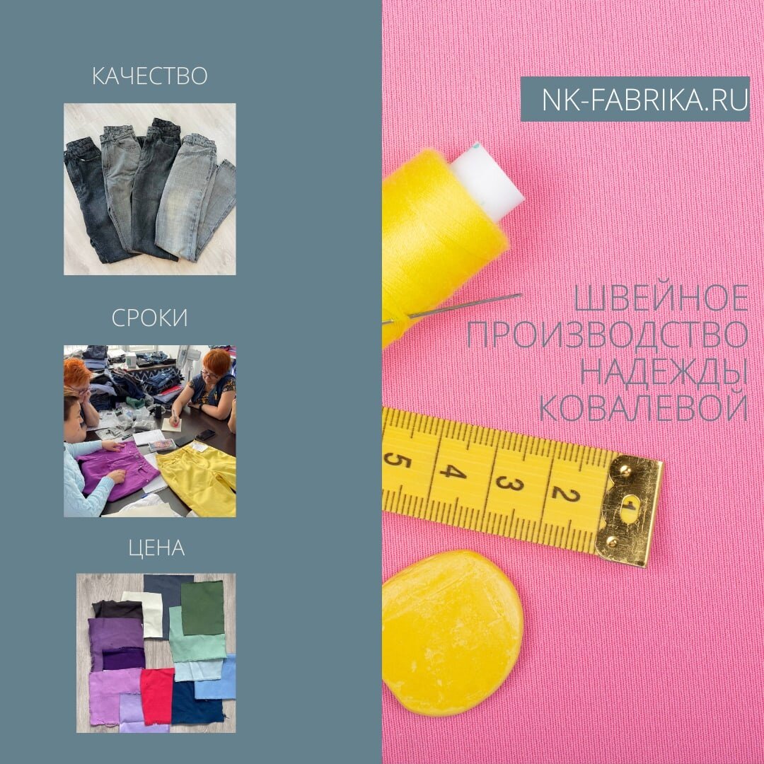 Три «кита», на которых держится наш швейный цех — это качество, срок и цена Швейное производство Надежды Ковалевой зарекомендовало себя на рынке как ответственный и надёжный партнёр. Оно соответствует всем тем критериям, которые необходимы для плодотворного и долгого сотрудничества с заказчиками. Формула этого производства проста: качество, срок и цена = довольный клиент. Шьём качественно 1) Осуществляем пошив изделий качественно и без изъянов. Пуговицы пришиваем надёжно, можно сказать, «намертво». Берём в работу как большие (оптовые) заказы, так и малые партии от 50 единиц. Перед пошивом показываем изделия «с потока», чтобы вы могли наглядно убедиться в качестве изделий на выходе. Пошив в срок 2)Шьём строго в срок. Пошив партии занимает до 4-6 недель. Не срываем сроки пошива, поскольку ценим ваше время. Честные цены 3)Обговариваем цены заранее. Окончательная стоимость озвучивается только после пошива образца. Учитываются все нюансы и не назначаются цены «с запасом». Если вас всё