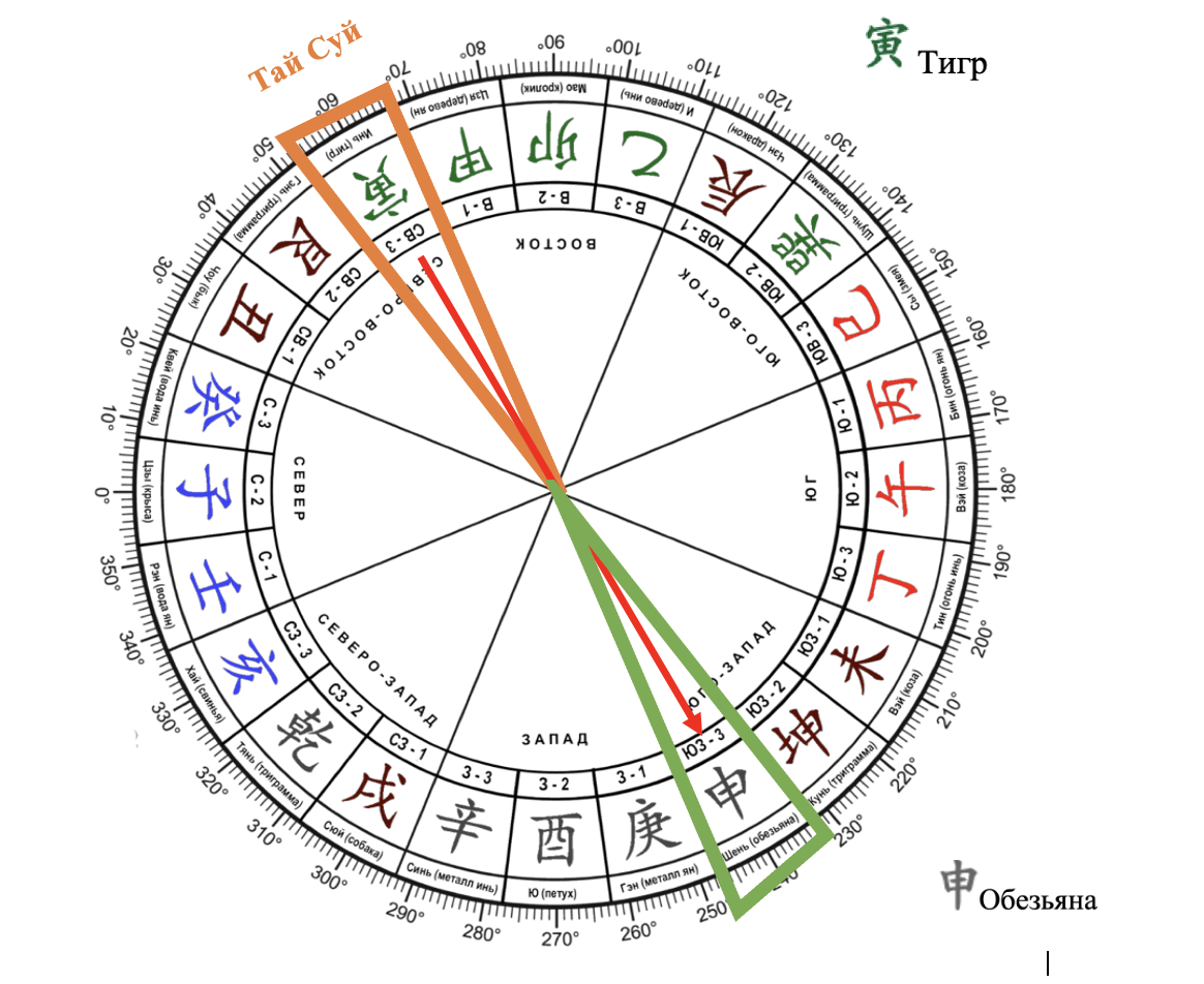Тай Суй – это «взгляд» Юпитера, его еще называют Великий Герцог. Юпитер - важная социальная планета, которая дарует большое количество энергии, богатство, славу, успех и удачу. Но, эта очень мощная энергия может быть разрушительной. Каждый год Юпитер переезжает из сектора в сектор, меняя свое положение. С наступлением нового года по Китайскому календарю (3 или 4 февраля) Тай Суй меняет свое положение. Тай Суй находится в секторе животного, год которого наступил. Тау Суй - это очень мощная энергия, ее мощь может быть разрушительной. Если вы сидите спиной к Тай Суй, он дарует вам поддержку, но, если вы поворачиваетесь лицом к Тай Суй (к энергии луча Юпитера), он может вас снести потоком своей мощи. Рассмотрим на примере 2022 года, это год Водного Тигра (Северо-Восток 3). Поэтому в 2022 году, крайне неблагоприятно сидеть лицом в Северо-Восточный сектор (даже если это направление благоприятно для вас по числу ГУА). И хорошо сидеть спиной к Северо-Востоку, что получается лицом в Юго-Запад.
