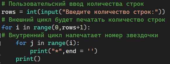 Python позволяет нам вложить любое количество циклов for внутрь цикла for. Внутренний цикл выполняется n раз за каждую итерацию внешнего цикла. Пример 1: Вложенный цикл for Вывод: Пример 2: Программа для печати пирамиды чисел. Вывод: Использование оператора else в цикле for В отличие от других языков, таких как C, C++ или Java, Python позволяет нам использовать оператор else с циклом for, который может быть выполнен только тогда, когда все итерации исчерпаны. Здесь мы должны заметить, что если цикл содержит какой-либо оператор break, то оператор else не будет выполнен. Пример 1 Вывод: Пример 2 В приведенном выше примере цикл прерван из-за оператора break, поэтому оператор else не будет выполнен. Будет выполнен оператор, находящийся непосредственно рядом с блоком else. Вывод: Цикл был прерван, благодаря оператору break.